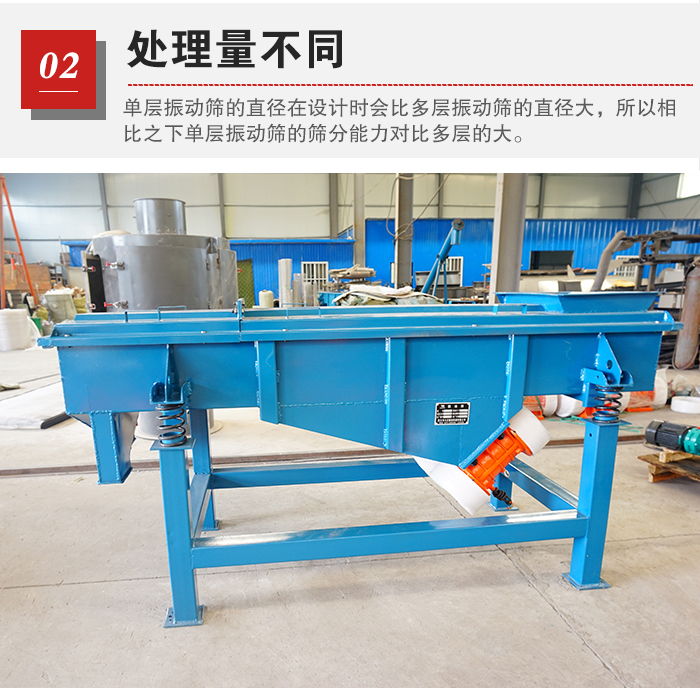 單層振動篩與多層振動篩在物料的篩分結(jié)果中會有,不同的分級例如:單層振動篩在篩分物料的時(shí)候只能篩分出兩種不同級別的物料,而多層振動篩就能夠篩分出多種不同級別的物料。