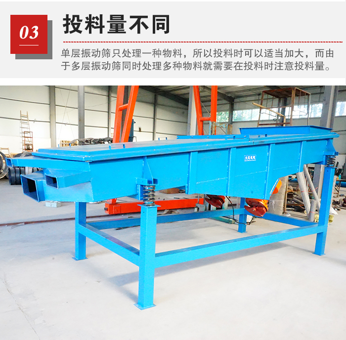 物料的篩分能力是由投料的大小有著直接關(guān)系的,由于單層振動篩只處理一種物料,所以投料時(shí)可以適當(dāng)加大,而由于多層振動篩同時(shí)處理多種物料就需要在投料時(shí)注意投料量。