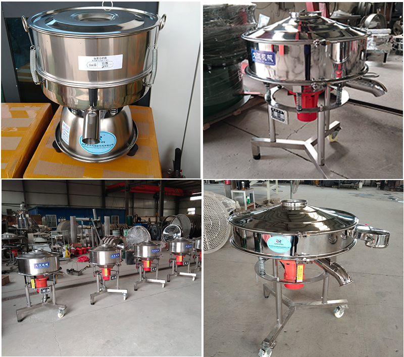 高頻篩主要由:進料口,橡膠擋板,出料口,快速鎖緊裝置,振動電機等組成。