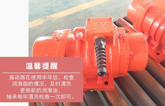 4、大漢機(jī)械溫馨提醒:振動(dòng)器在使用半年后,檢查潤滑脂的情況,如發(fā)現(xiàn)變干或者有硬塊時(shí),及時(shí)清洗更換新的潤滑油,軸承每年清洗檢查一次即可。