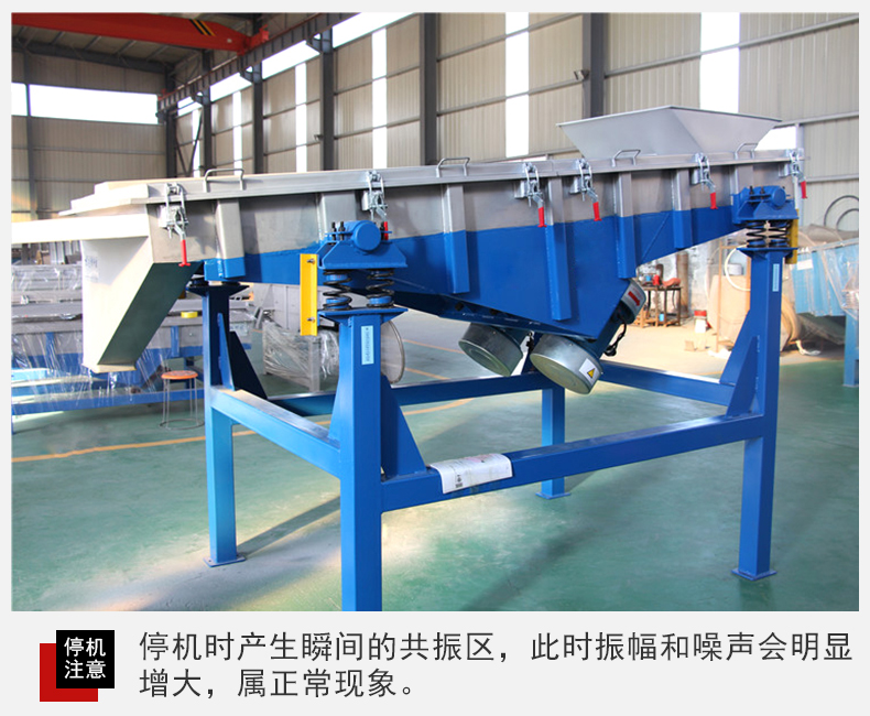 6、設(shè)備在停機時產(chǎn)生瞬間的共振區(qū),此時振幅和噪聲會明顯增大,屬正?,F(xiàn)象,設(shè)備在開停機前,篩面上不得有存留物料,篩網(wǎng)需經(jīng)常檢查是否張緊、破損,如有破損要即時更換。